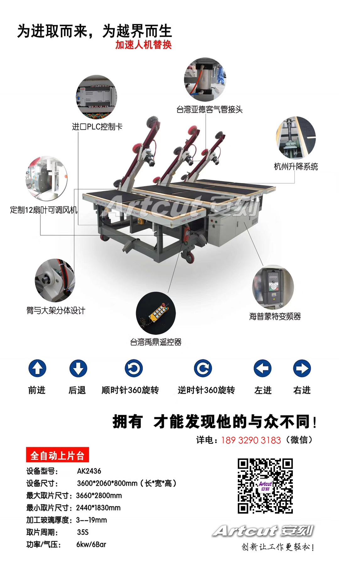 無線遙控操作裝置和完善的電器保護(hù)裝置,避免了人員的傷害以及財產(chǎn)損失,操作非常安全。上片自動變頻,內(nèi)置大功率空壓機(jī),無需附加氣路,可根據(jù)玻璃厚度任意調(diào)節(jié)氣浮臺風(fēng)量。設(shè)備設(shè)計有移動裝置;可自由移動,自動找正,直接移動到任意玻璃架前進(jìn)行下片操作。代替了傳統(tǒng)手工切割臺,只需一人完成上片、切割工作,節(jié)約了人力成本。設(shè)備適用于玻璃取片、切割、氣浮、掰片于一體,一鍵啟動,操作簡單,可360度旋轉(zhuǎn)。